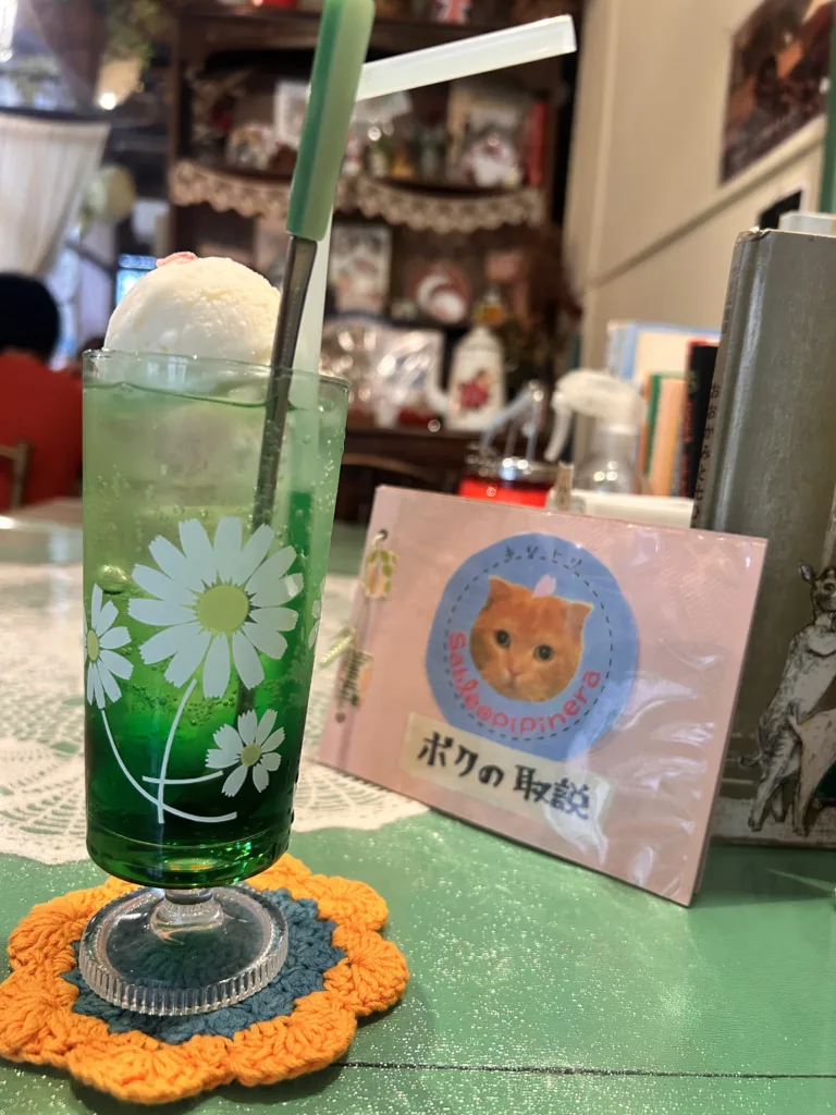 わたしが頼んだのは、お花のグラスに入ったメロンクリームソーダ。