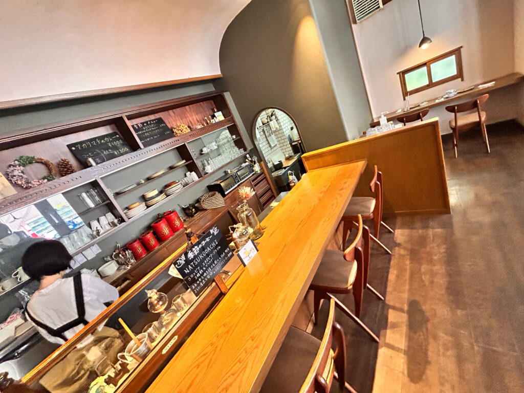 店内はカウンターとテーブル席がある落ち着いた空間で、木のぬくもりがとっても心地よいんだにゃ〜🌳